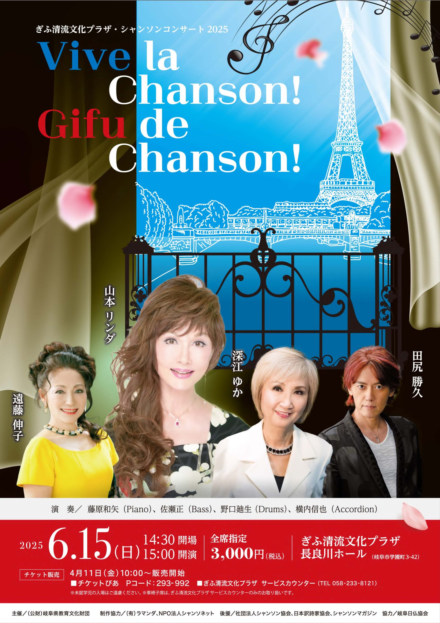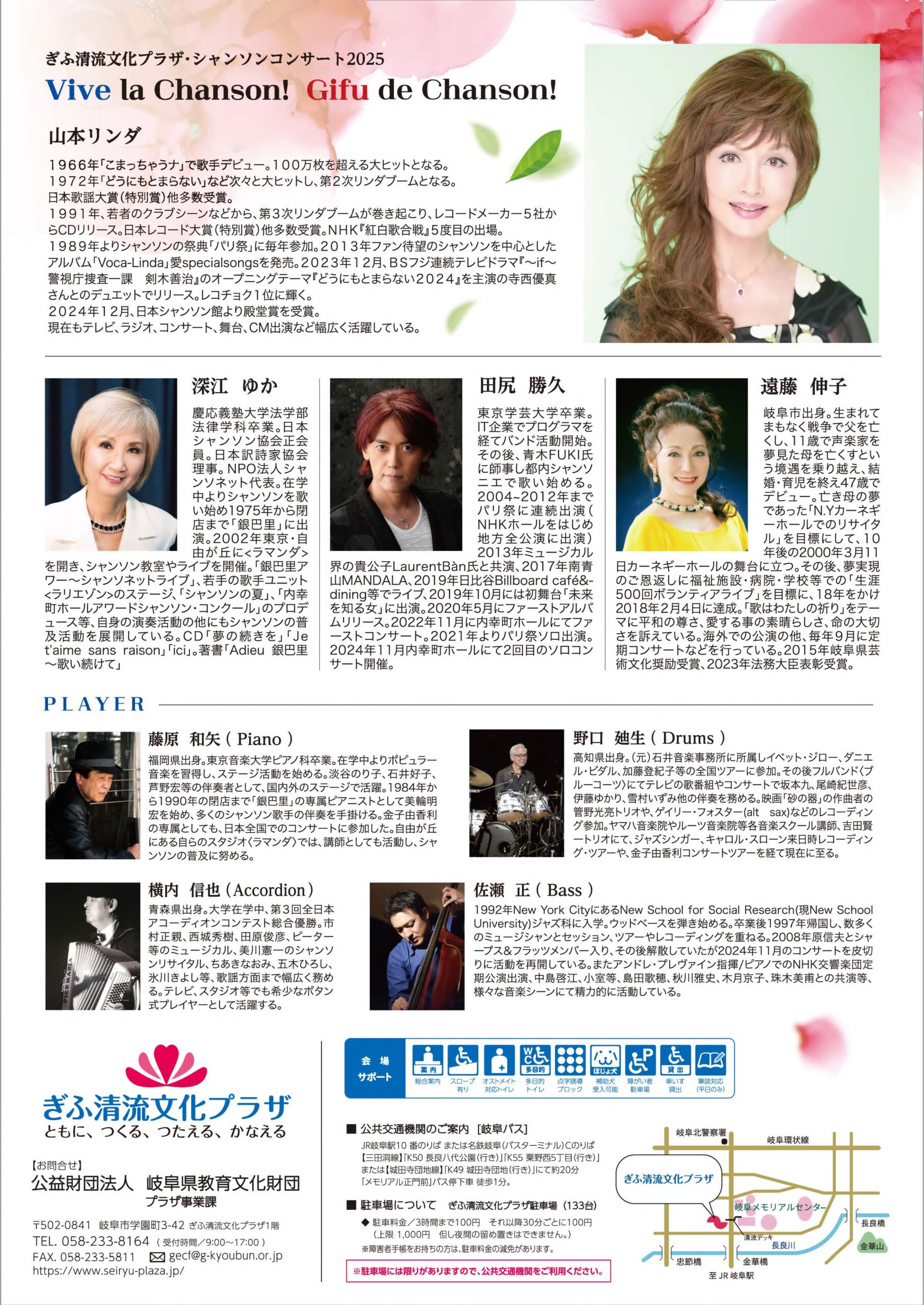 @長良川ホール 18:30 山本リンダ、深江ゆか、遠藤伸子、田尻勝久 pf:藤原和矢 bass:佐瀬正 dr:野口迪生 acc:横内信也 ご予約 tel 058-233-8121(ぎふ清流プラザサービスカウンター)
