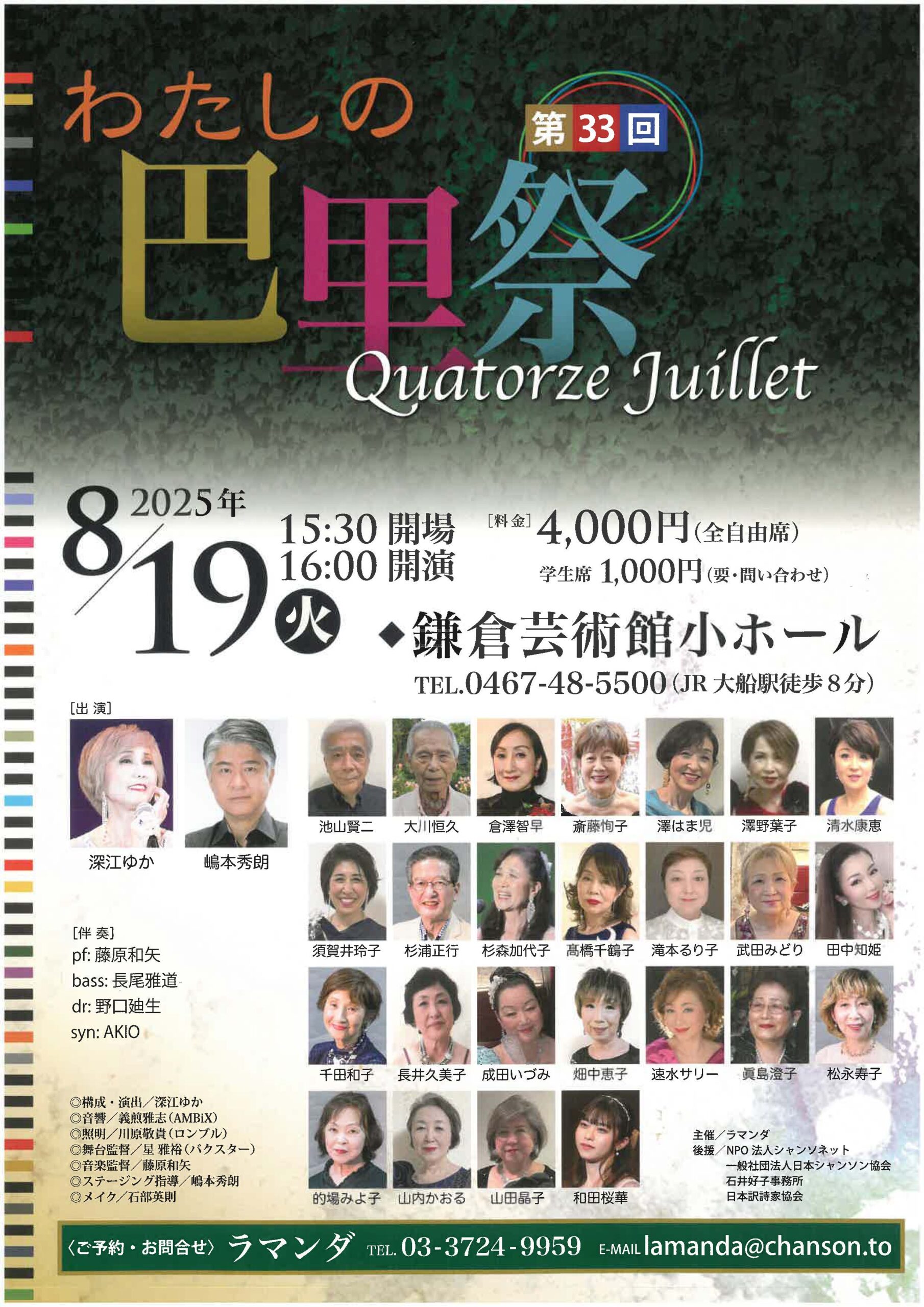 8/19火 第33回わたしの巴里祭 @鎌倉芸術館小ホール 深江ゆか&ラマンダシャンソン教室レヴォア pf:藤原和矢 bass:長尾雅道 dr:野口迪生 acc:横内信也 ご予約 tel 03-3724-9959(ラマンダ)